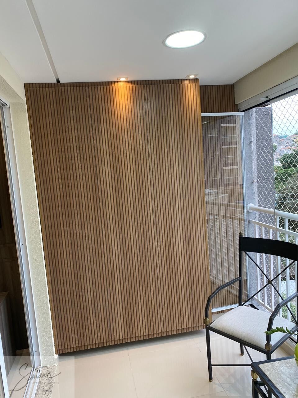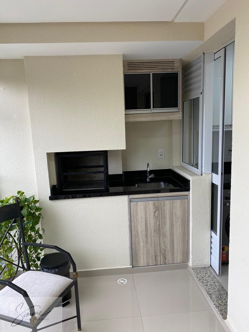 varanda gourmet com churrasqueira a carvão e com armários.