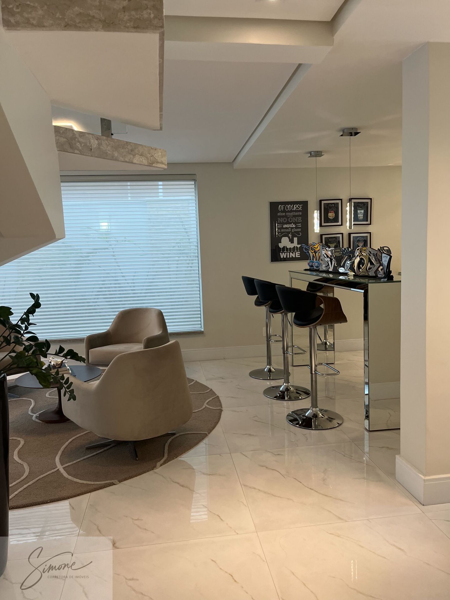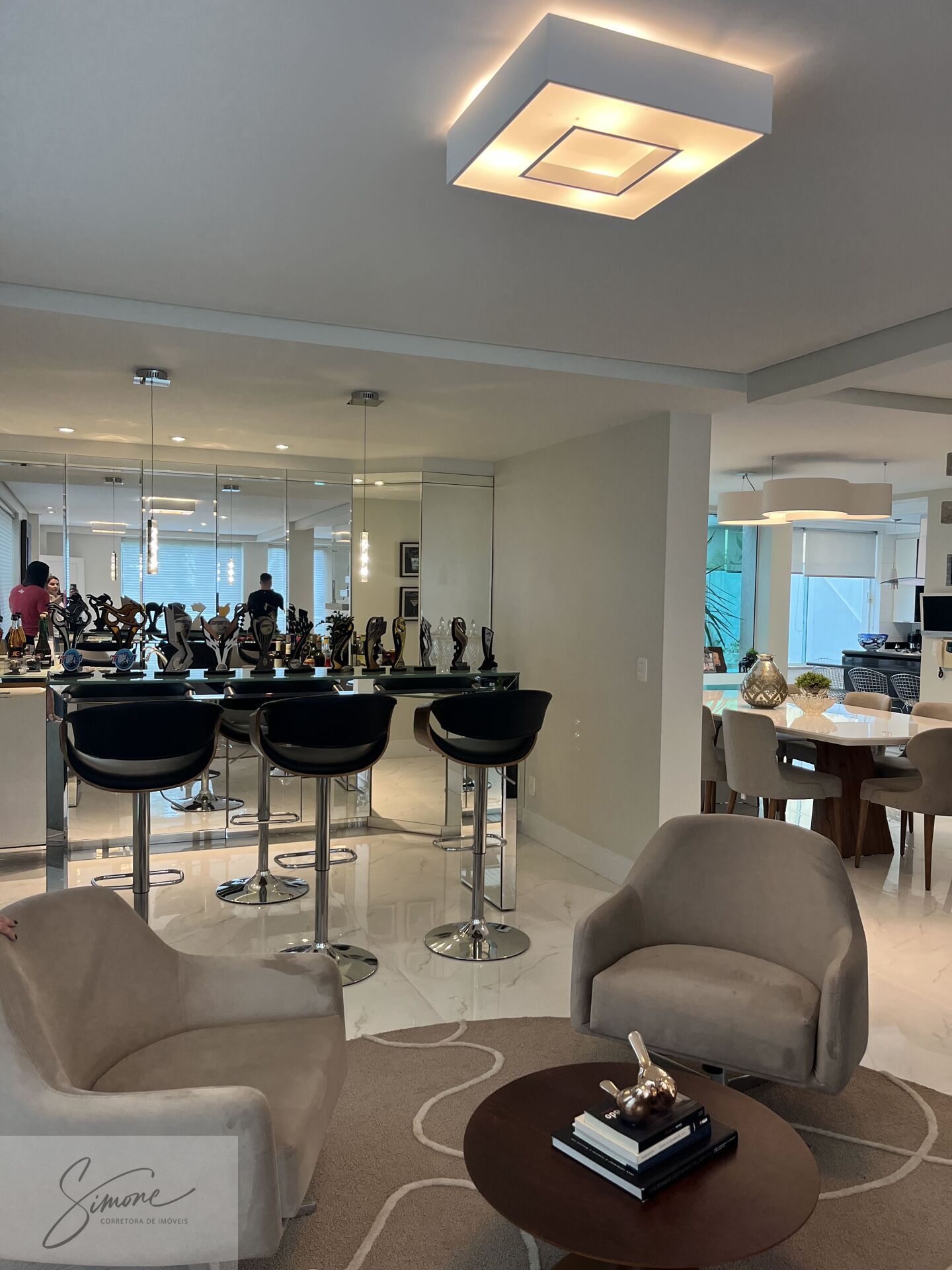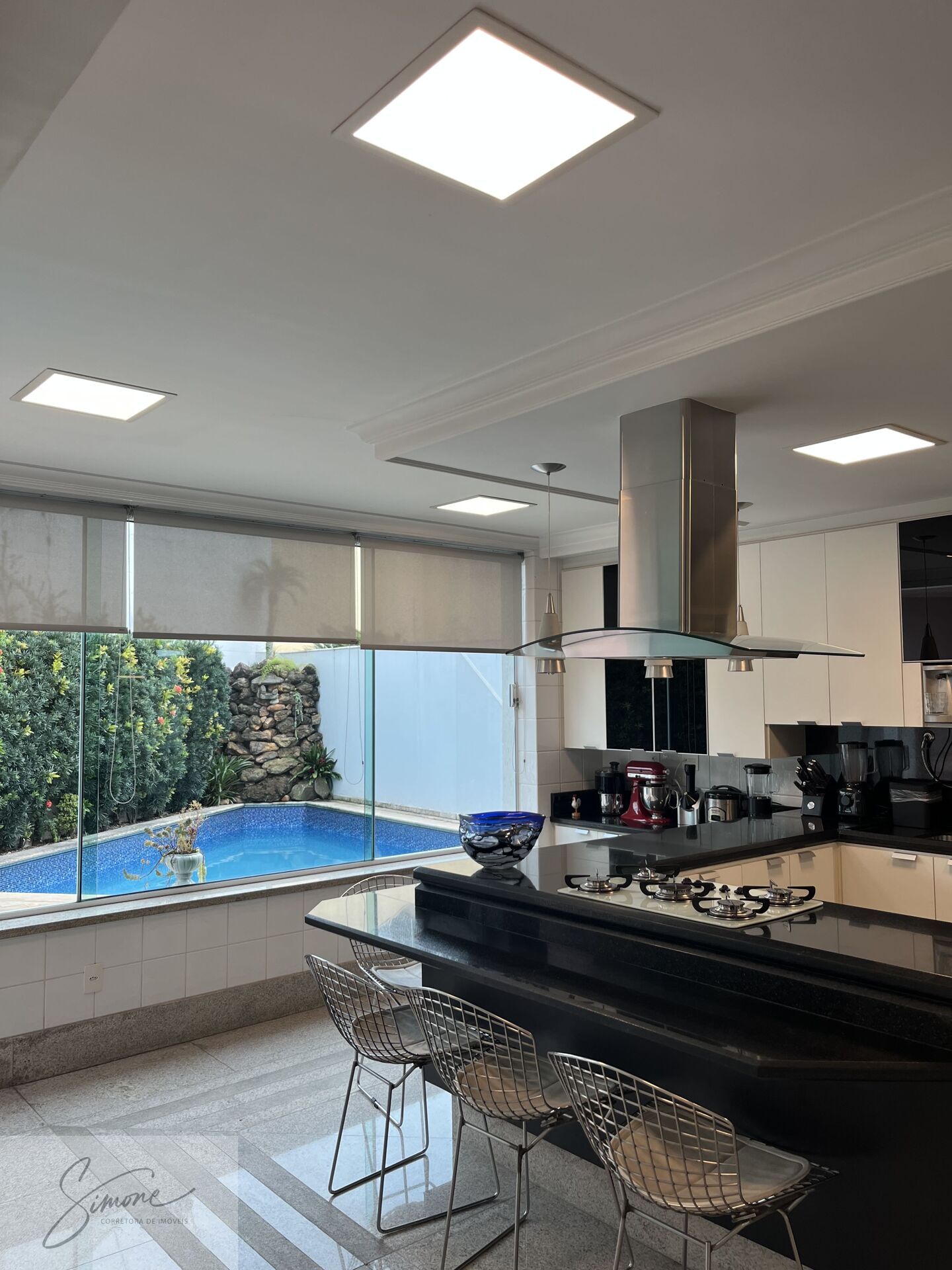 sala de estar, jantar e bar, sala de cinema, lavabo, cozinha planejada com ilha, área de serviço, garagem para 6 carros, deposito e cozinha de apoio.